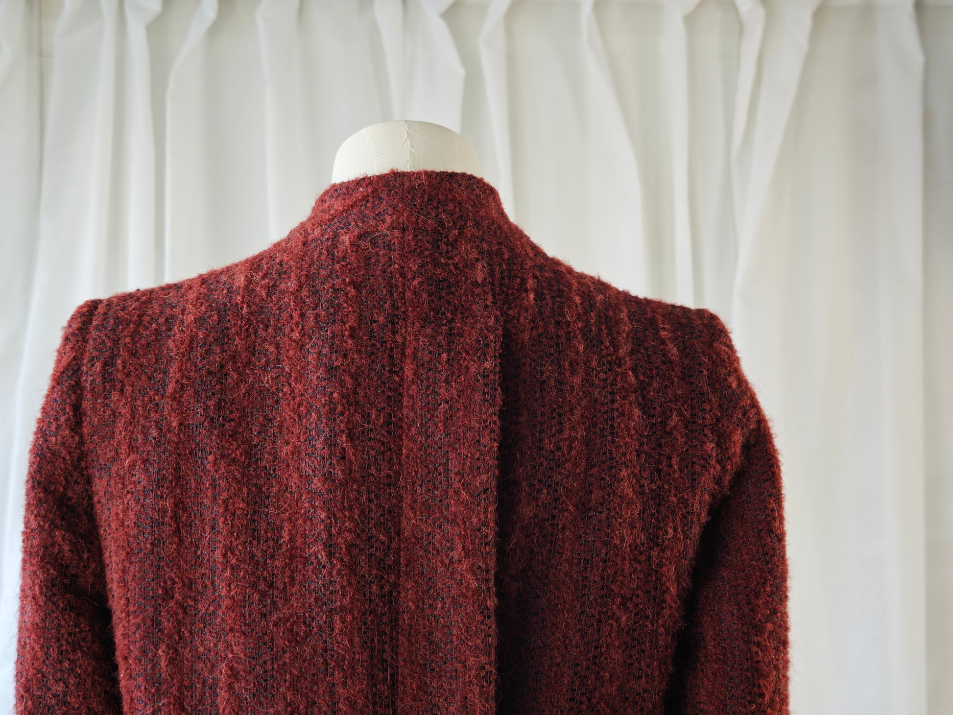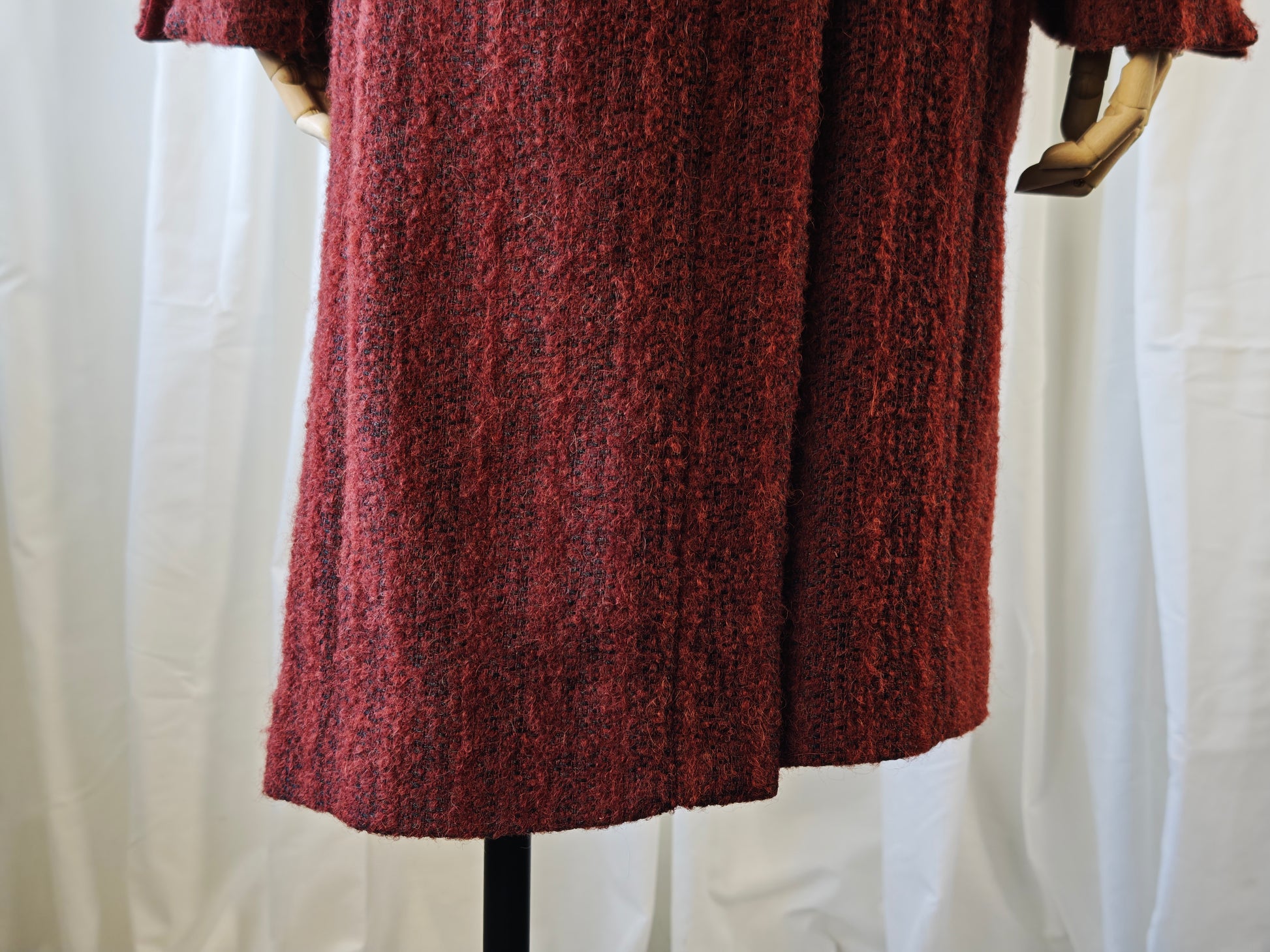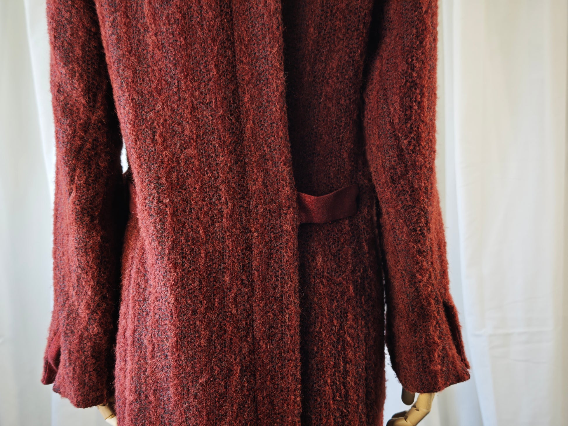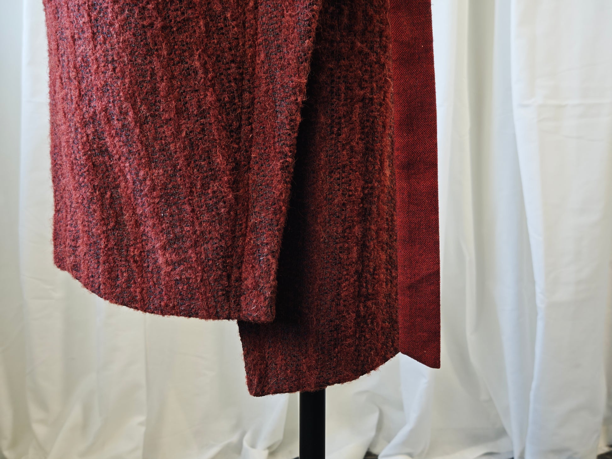 Burgundy Ann Demeulemeester Asymmetric wrap coat. The coat consists of 2 different fabrics weaved together