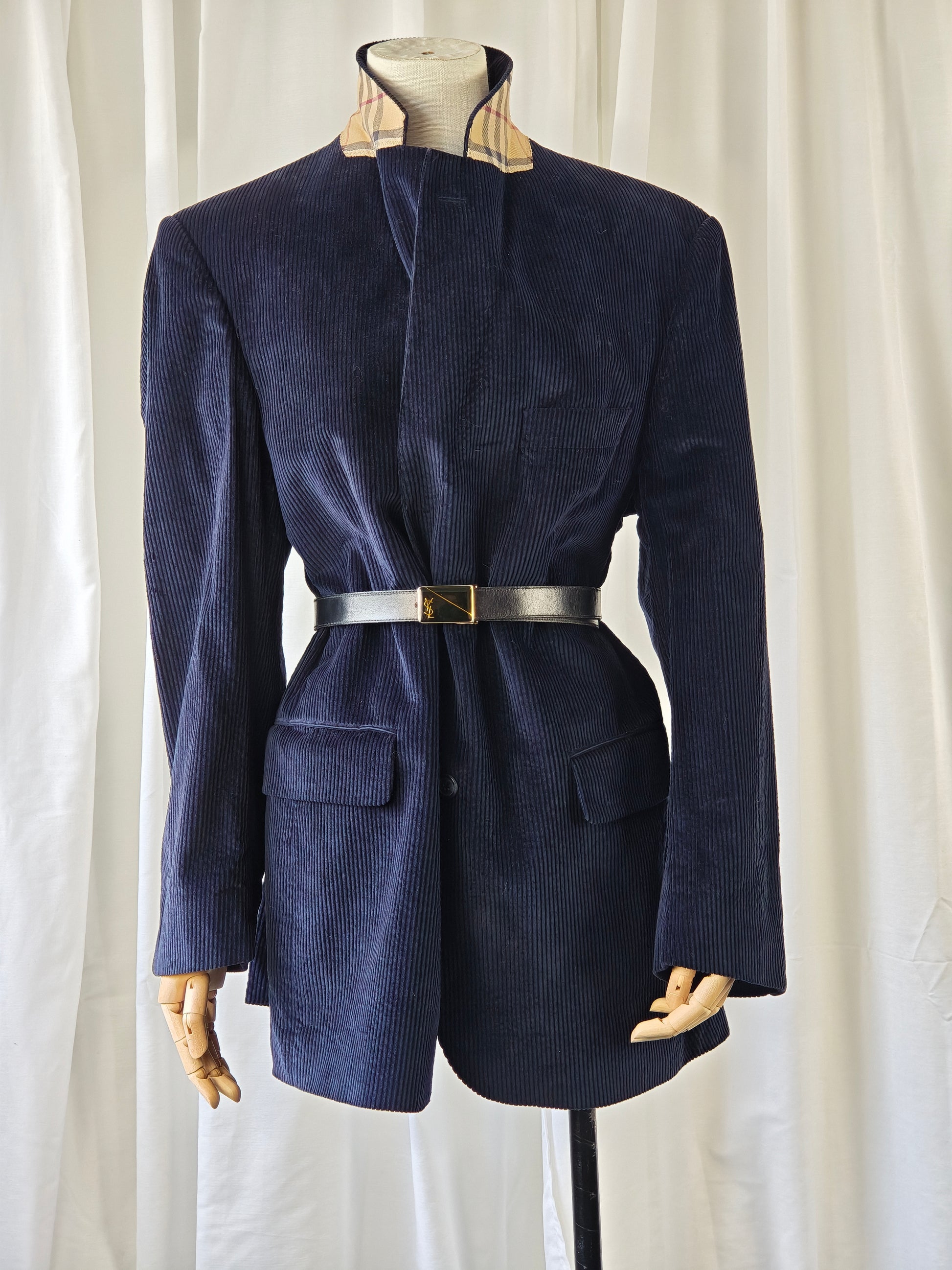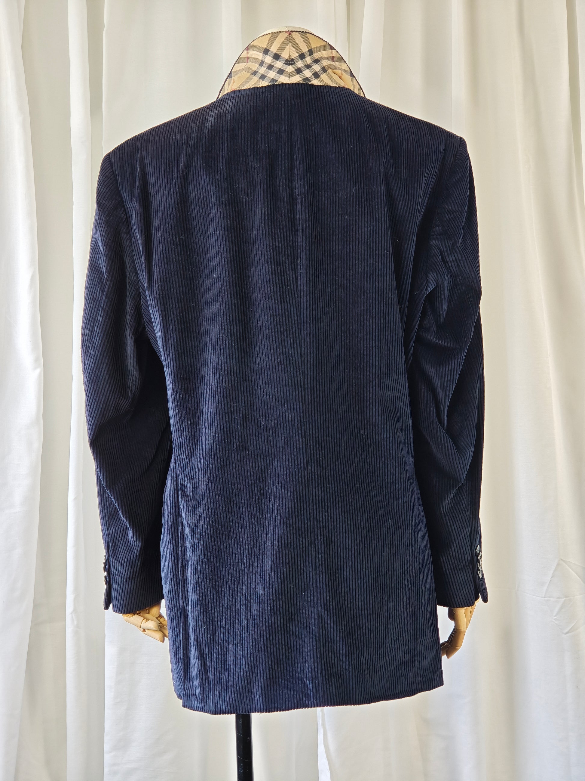 beautiful corduroy navy blazer, with classic burberry nova check details on the collar.