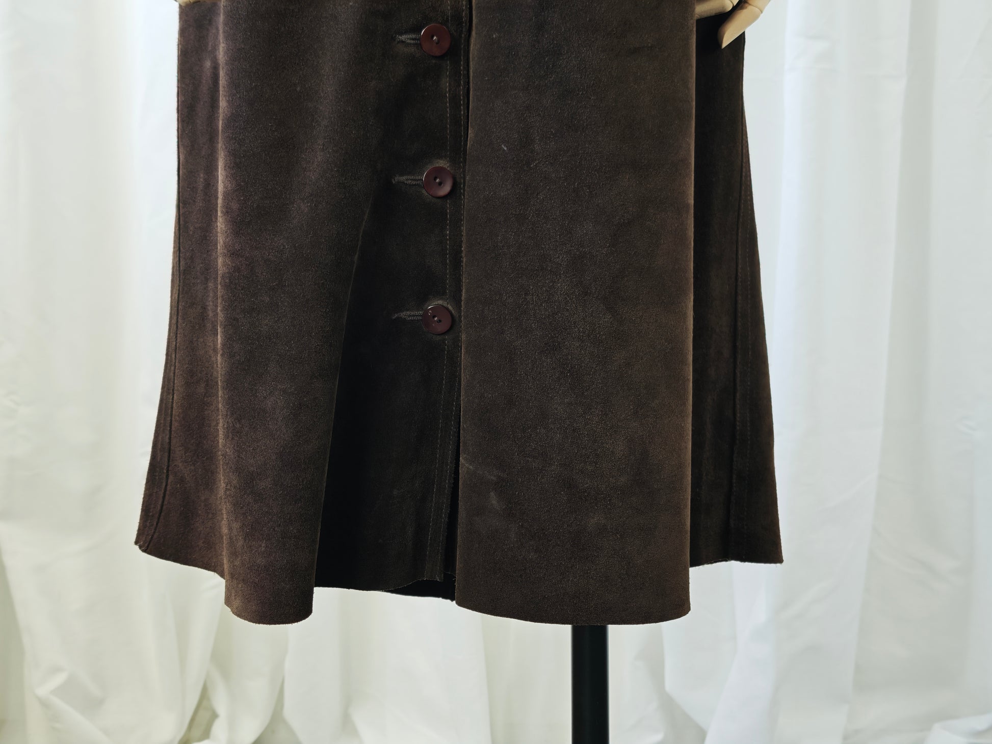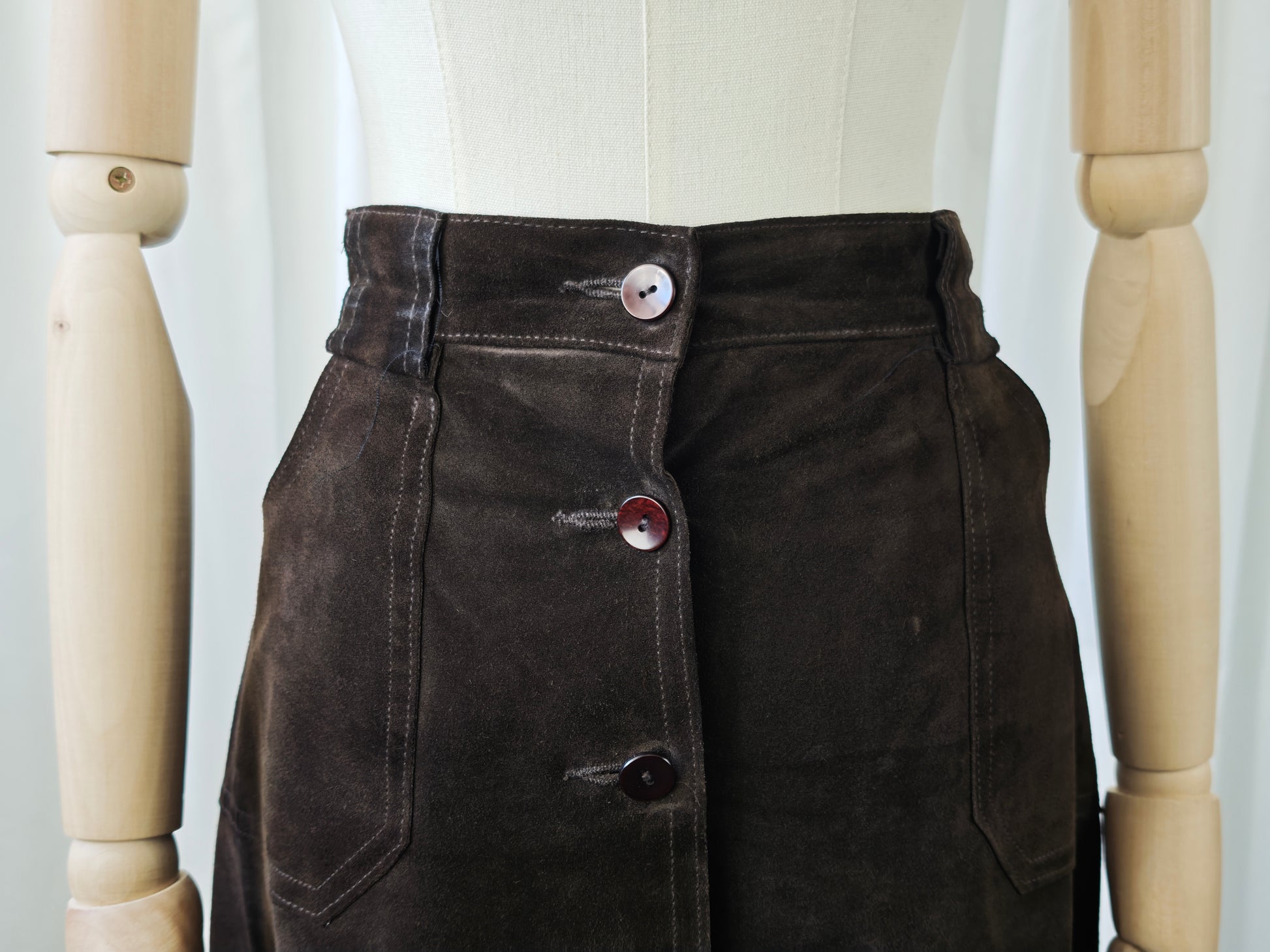 Chocolate brown suede midi skirt with front button closure two front pockets and belt loops. The skirt is in perfect condition.