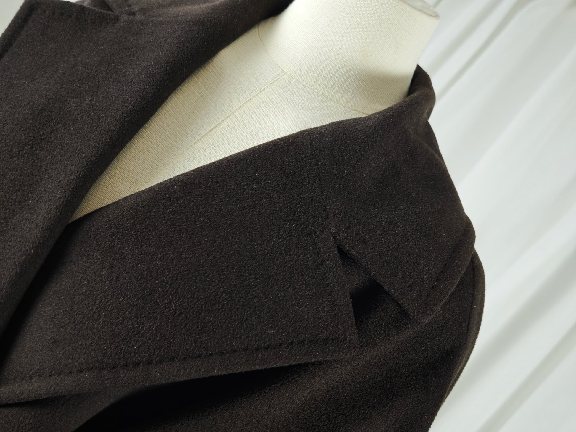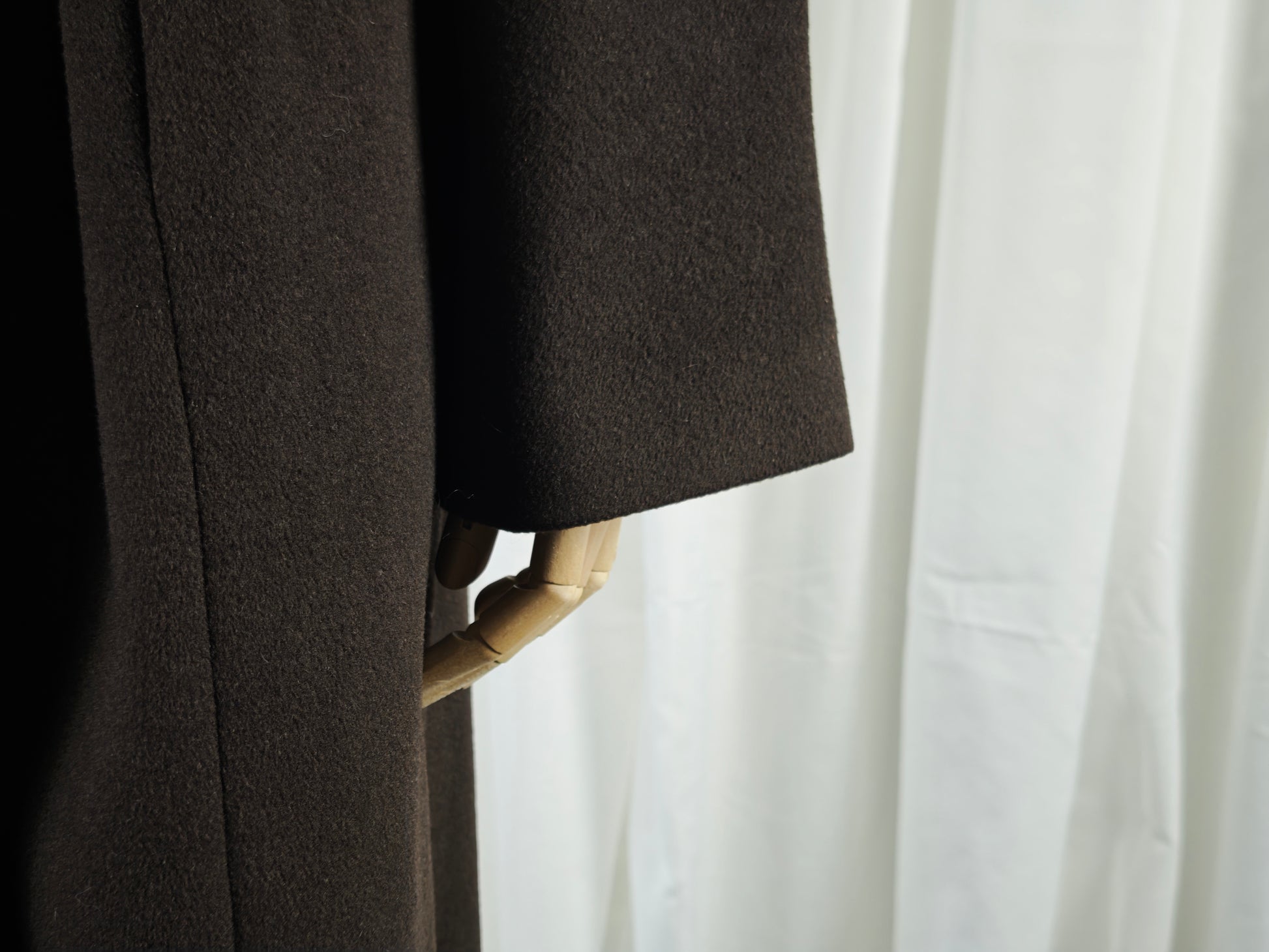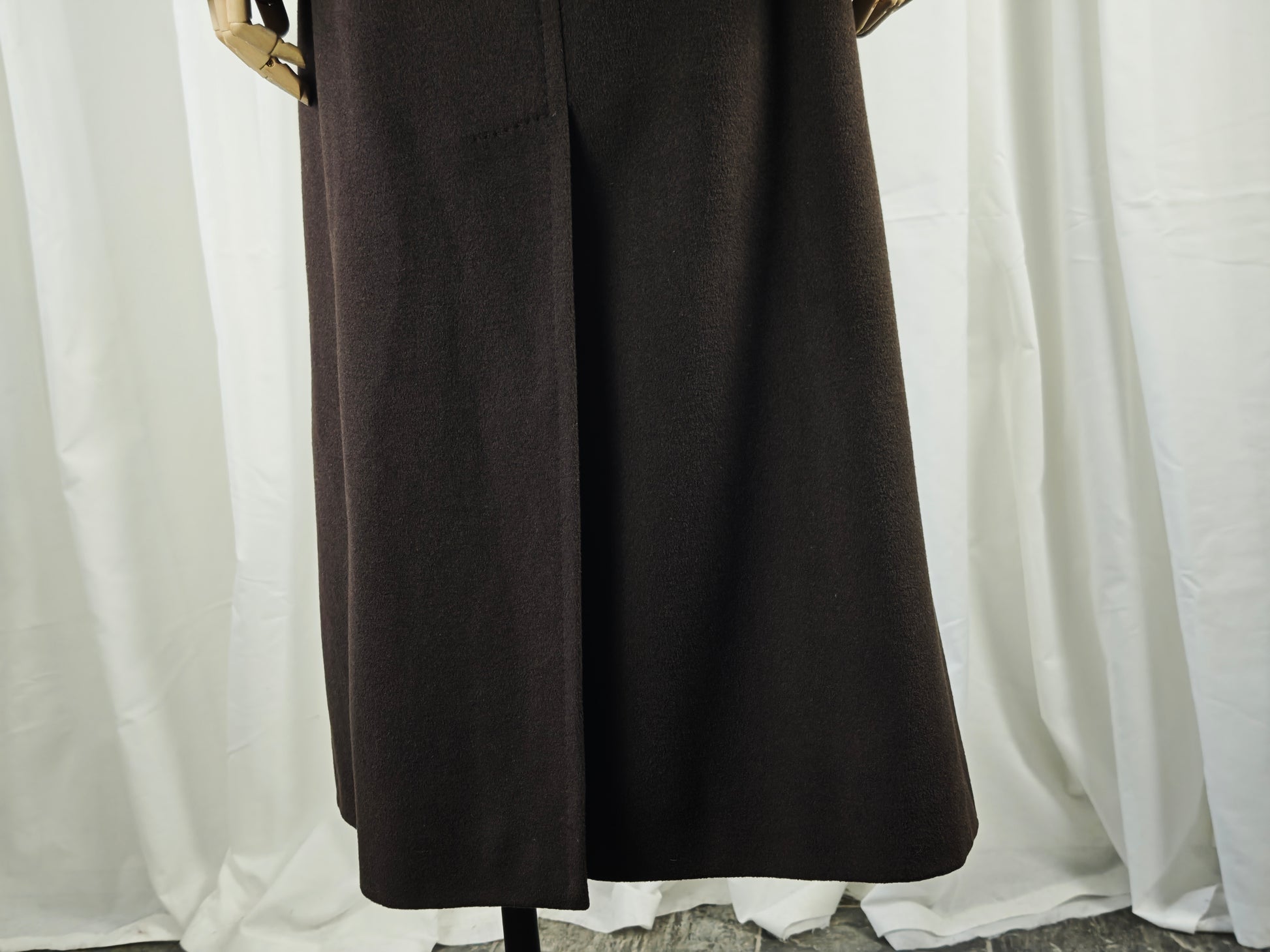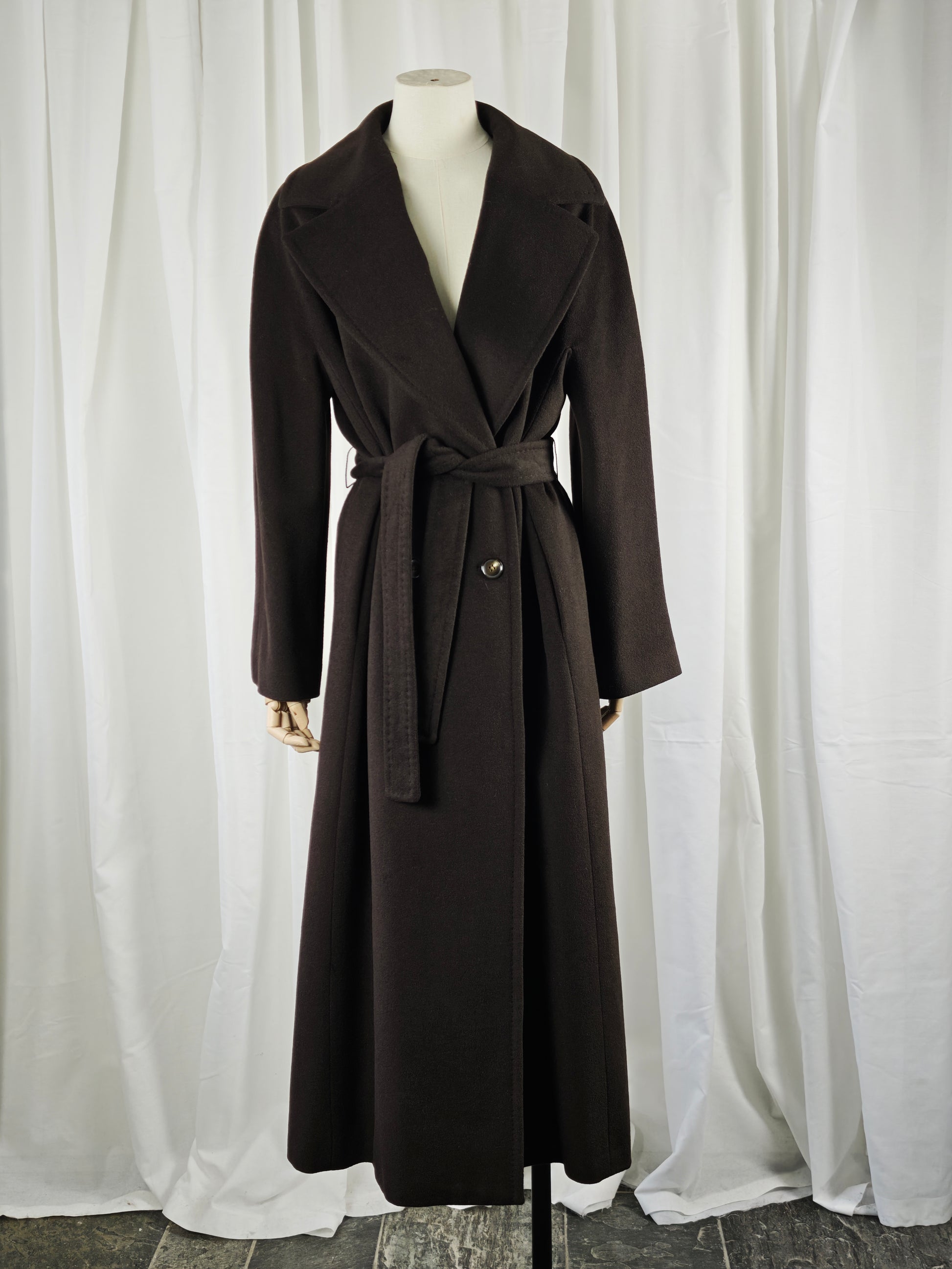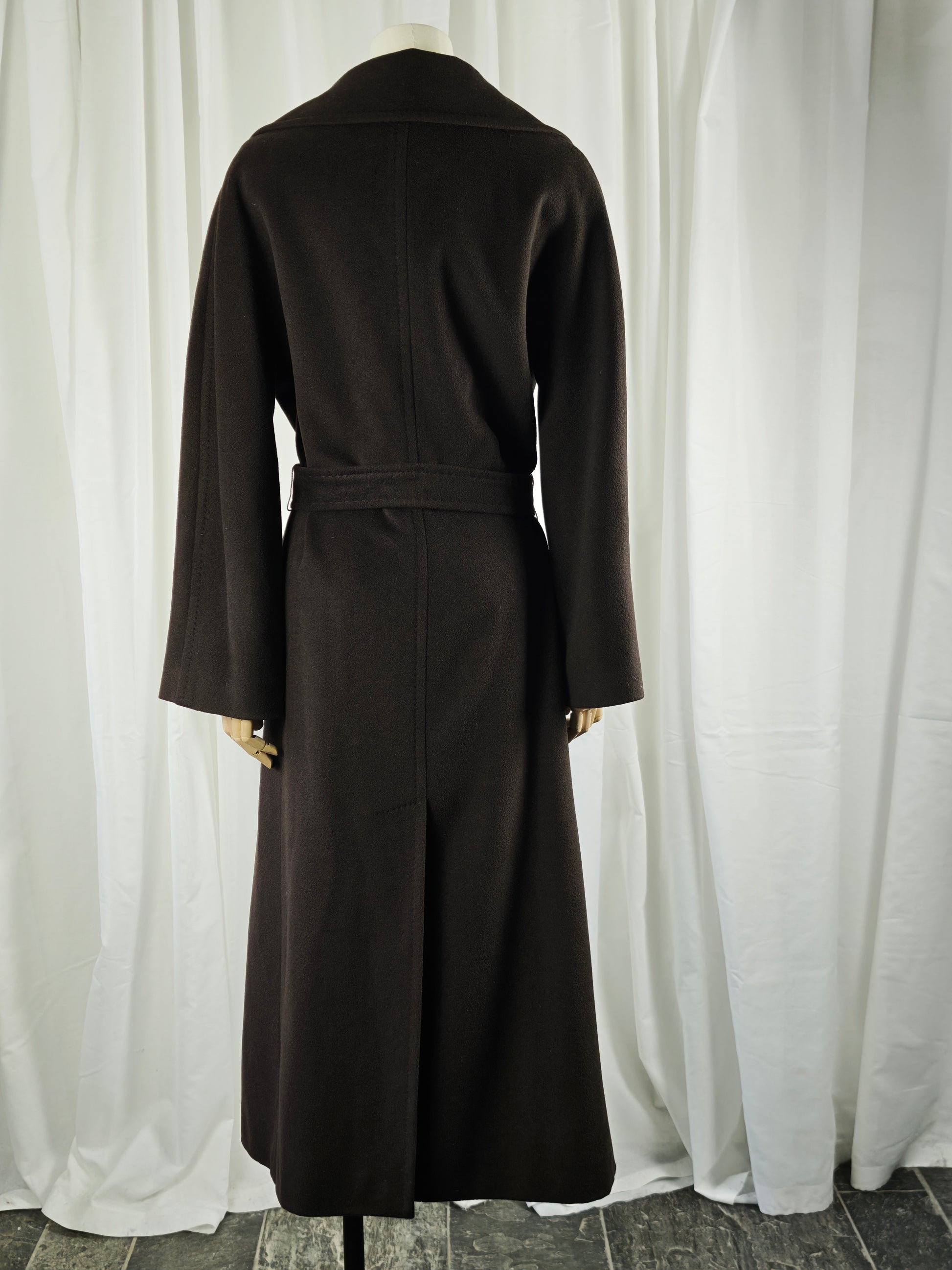 Chocolate brown maxi coat made from high quality wool and silk. Double breasted with belted closure. Perfect condition.