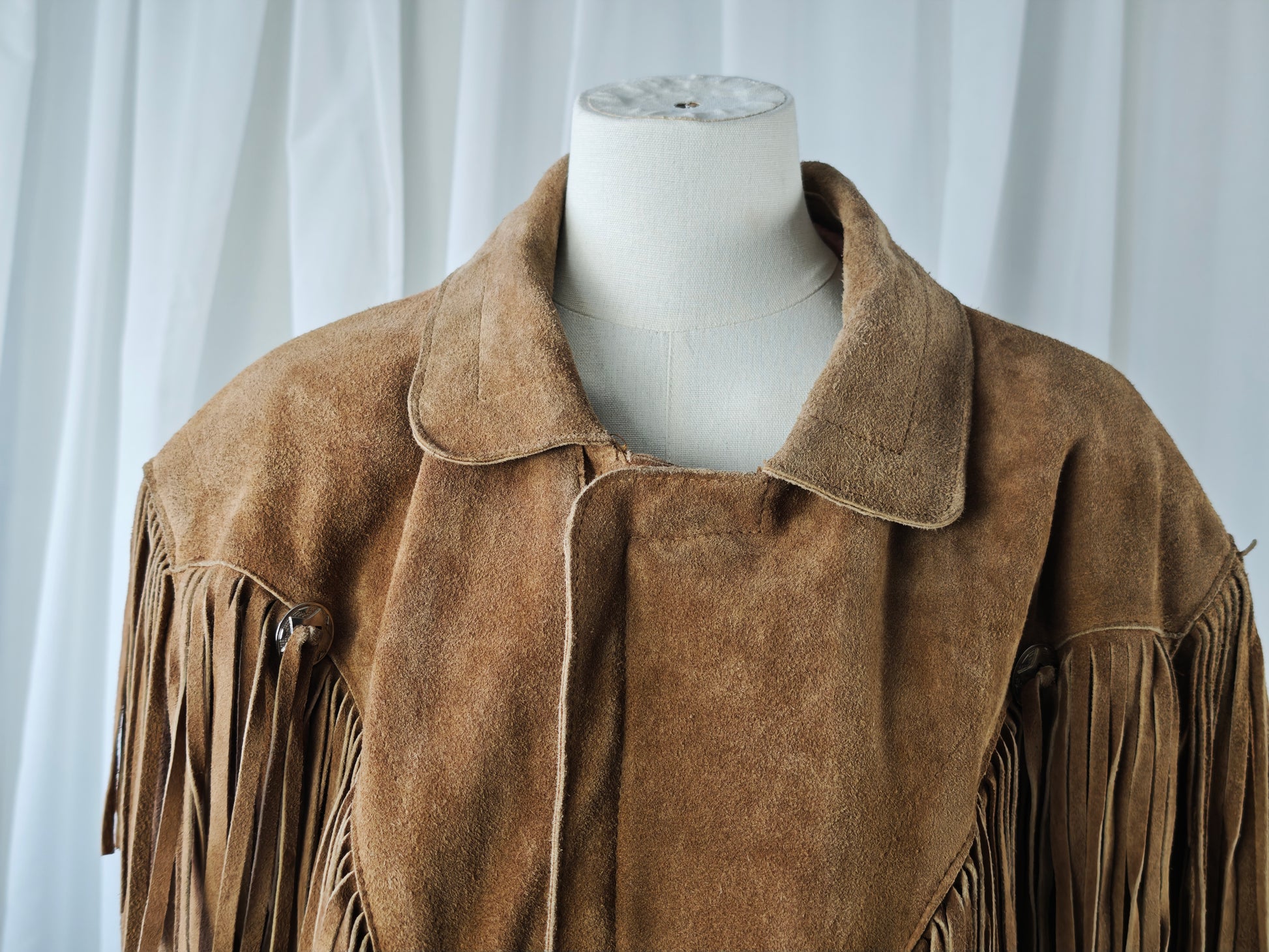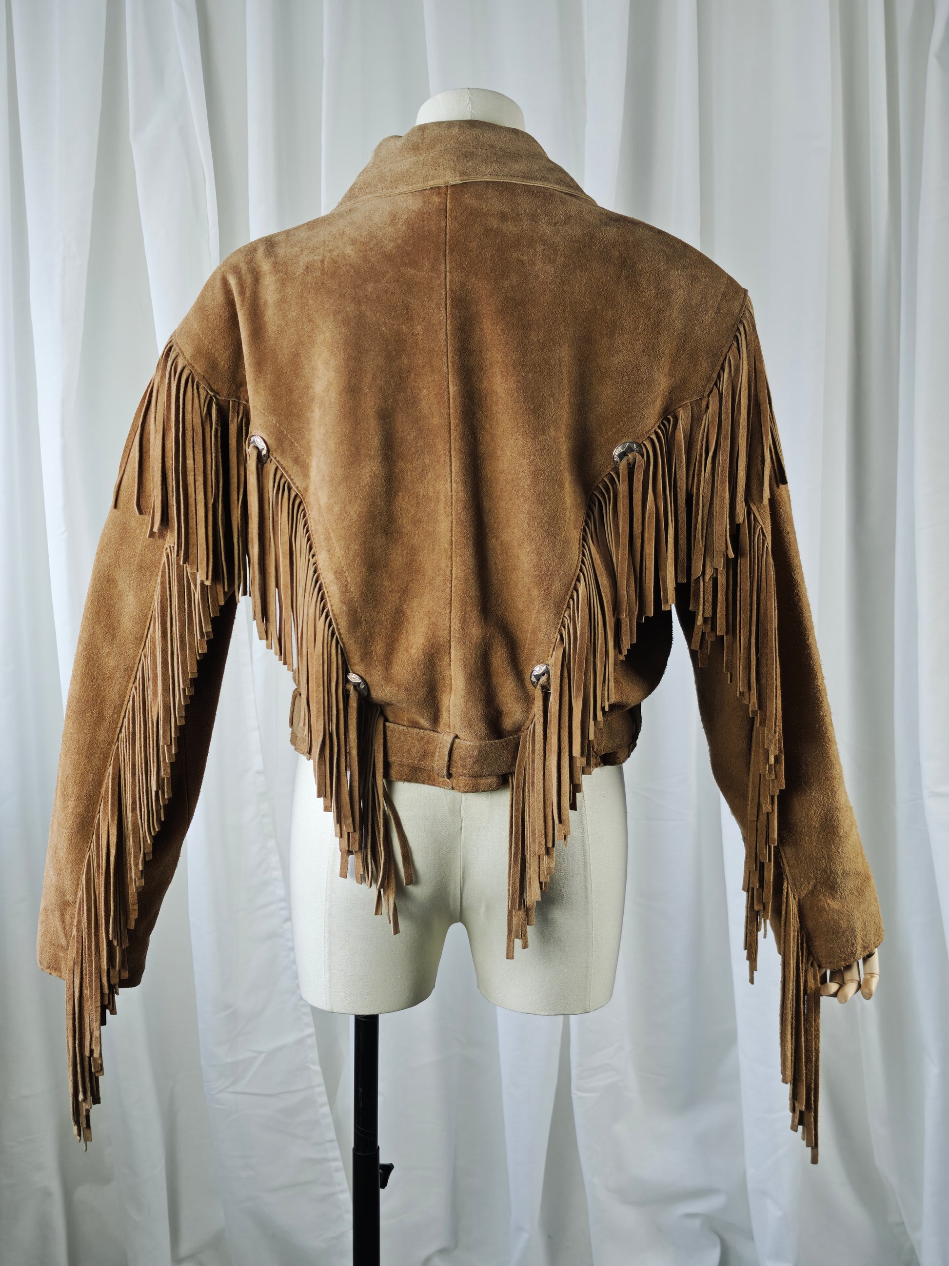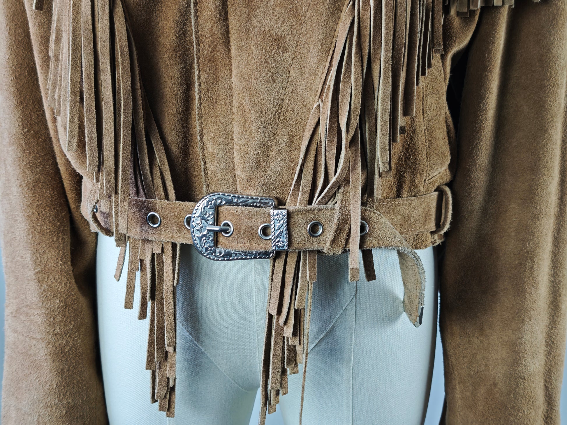 Vintage cropped belted suede fringe jacket. The jacket is missing some fringes on the right arm. (see picture). Good overall condition.