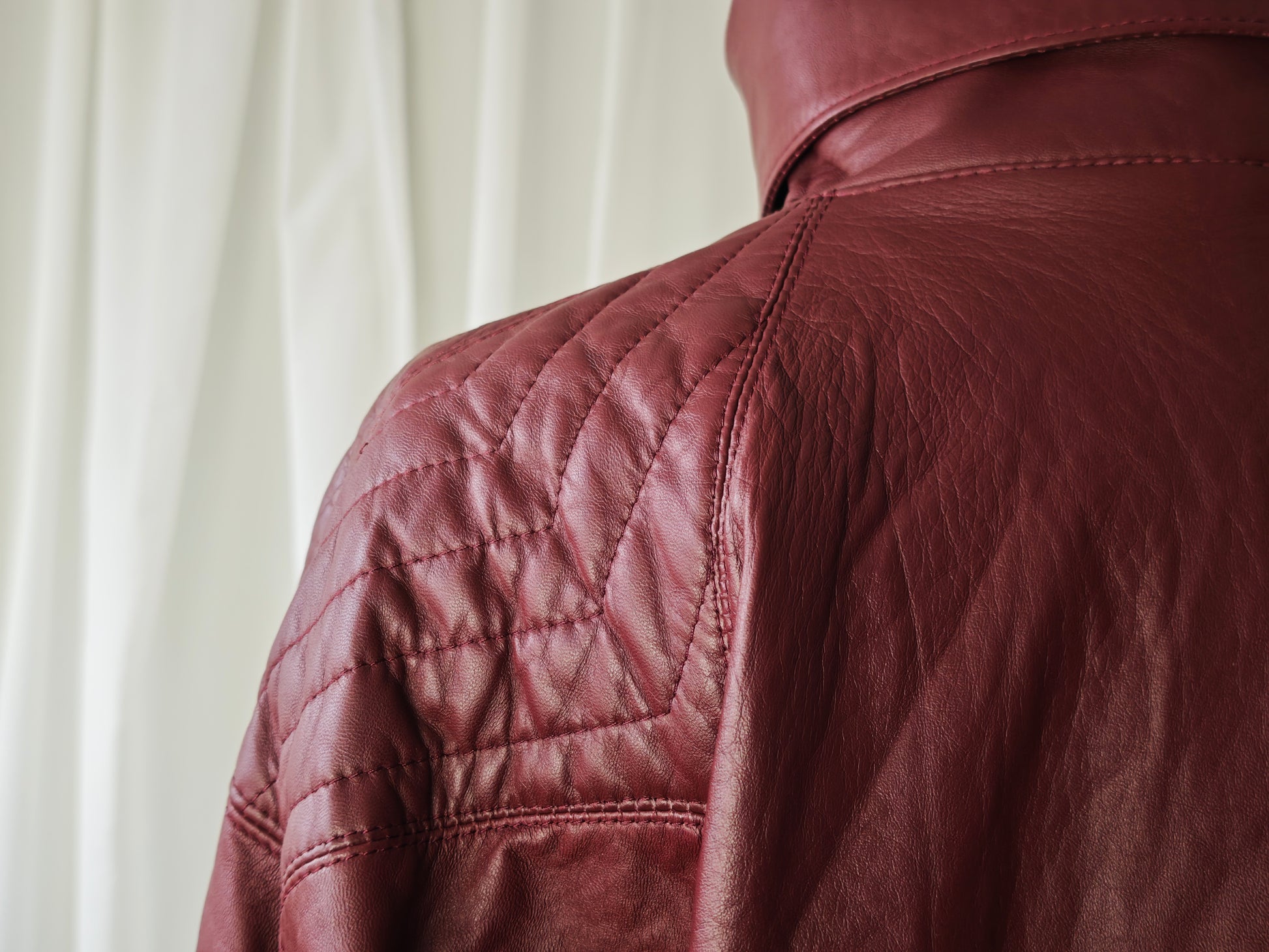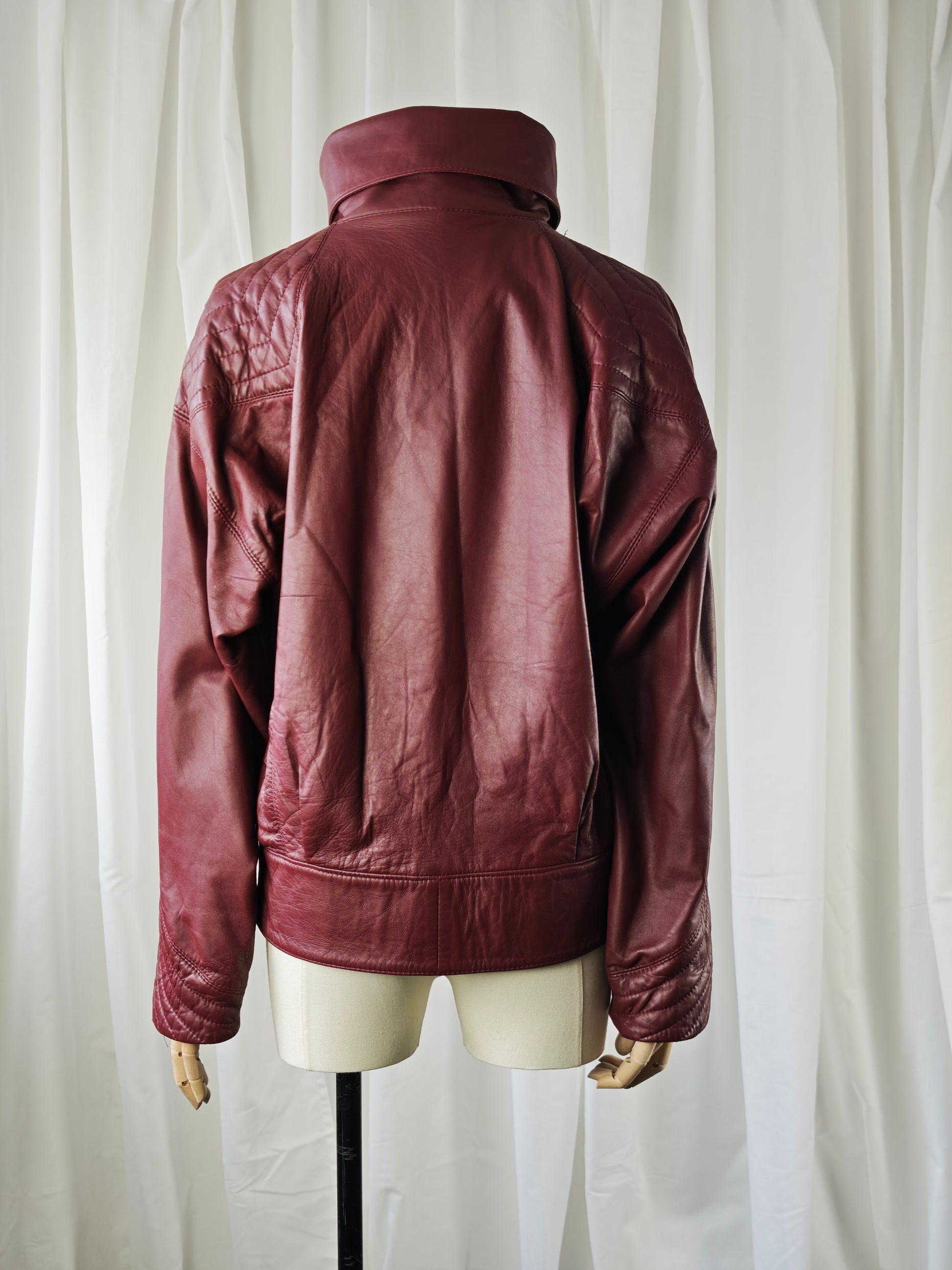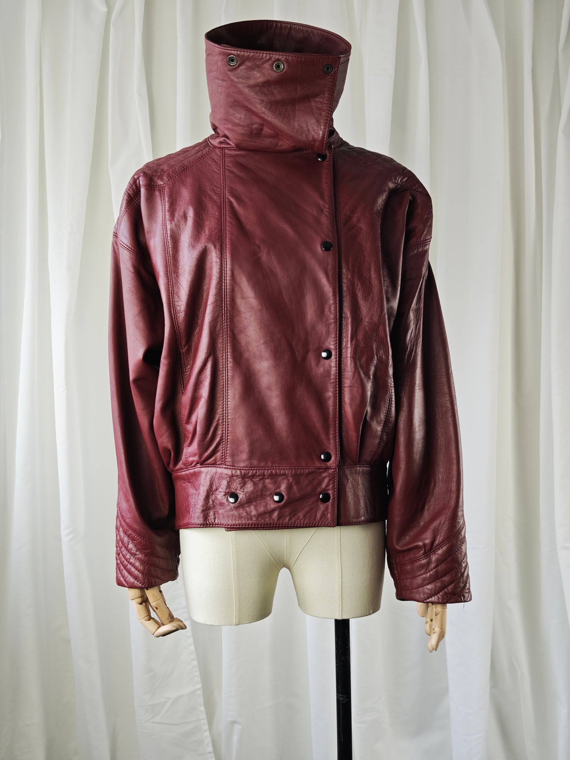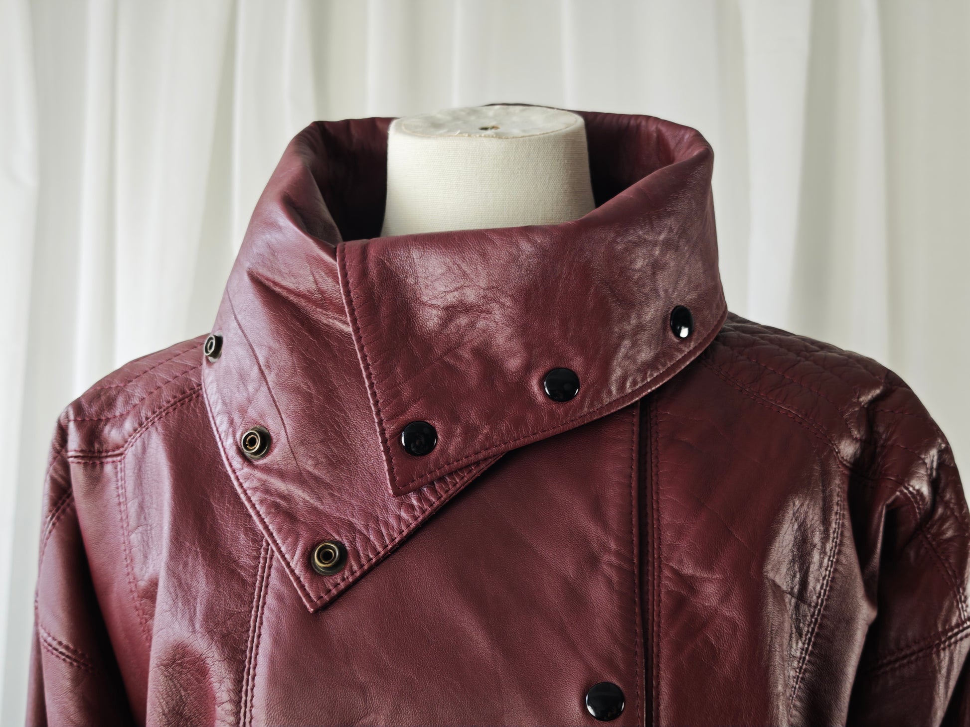 Vintage 80's burgundy funnel neck lightweight aviator jacket, The collar of this jacket can be worn in multiple ways. snap button closure.