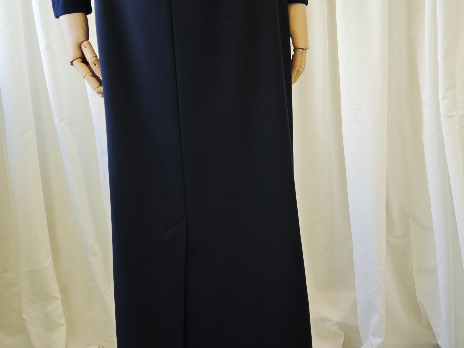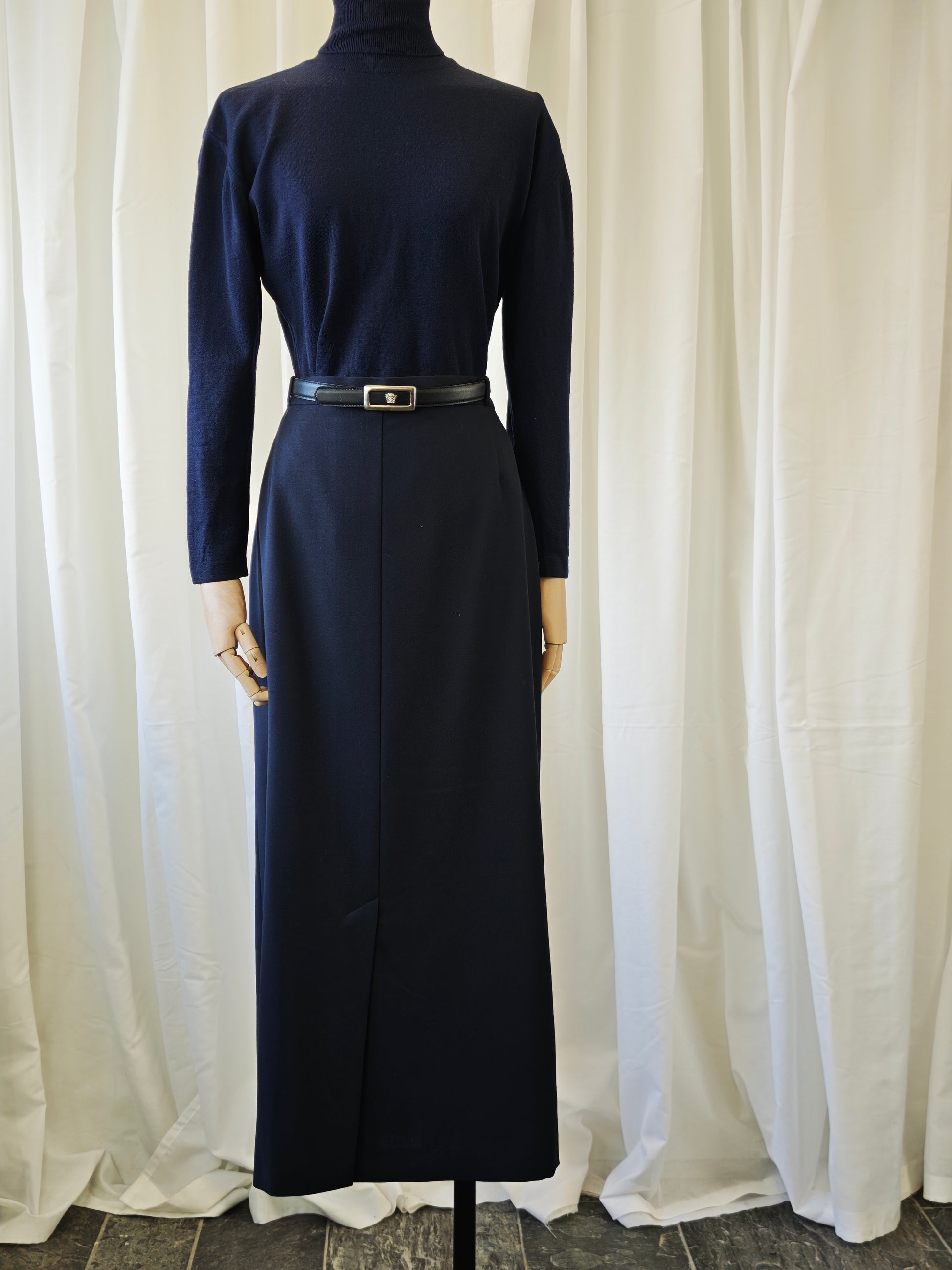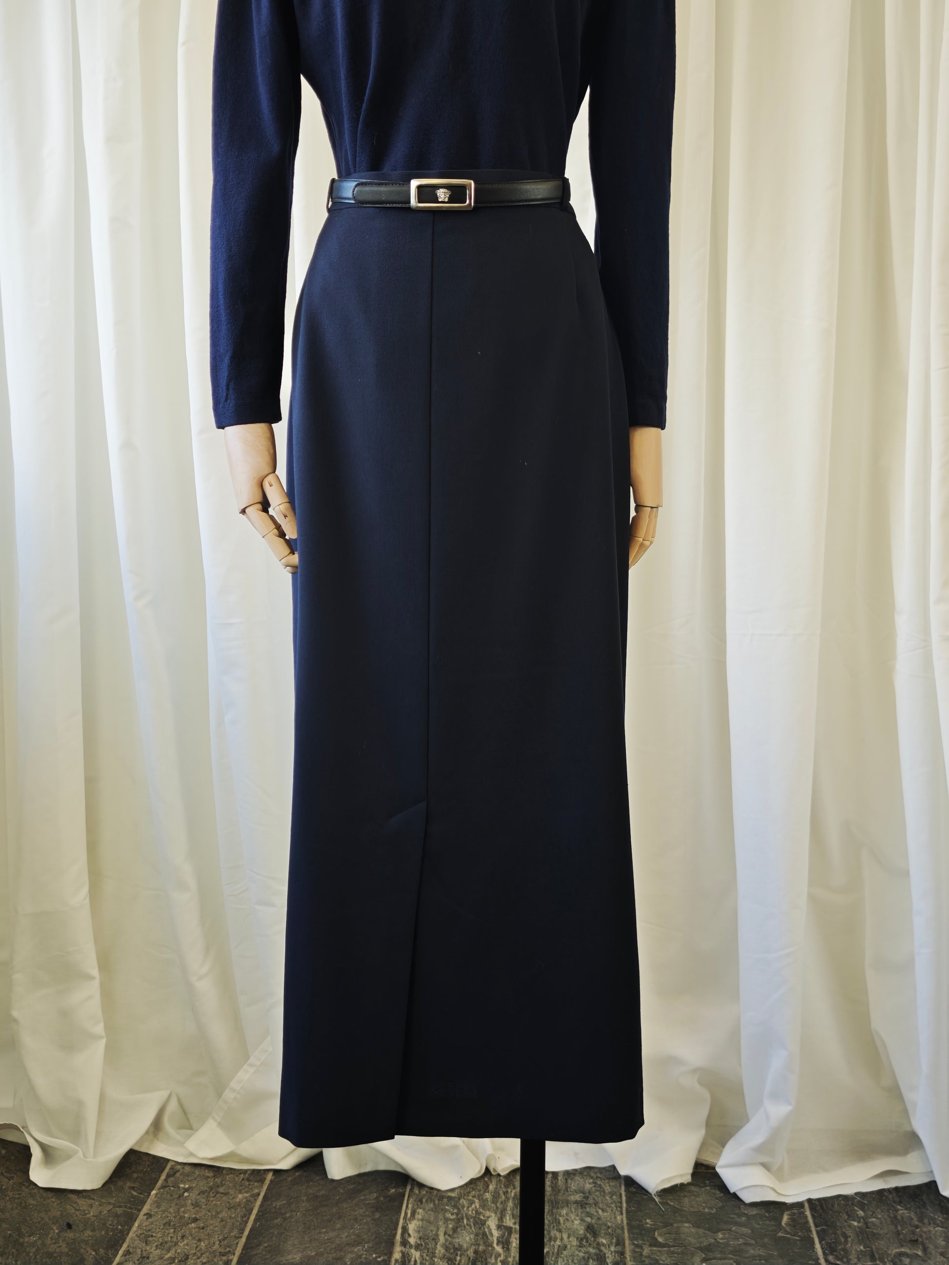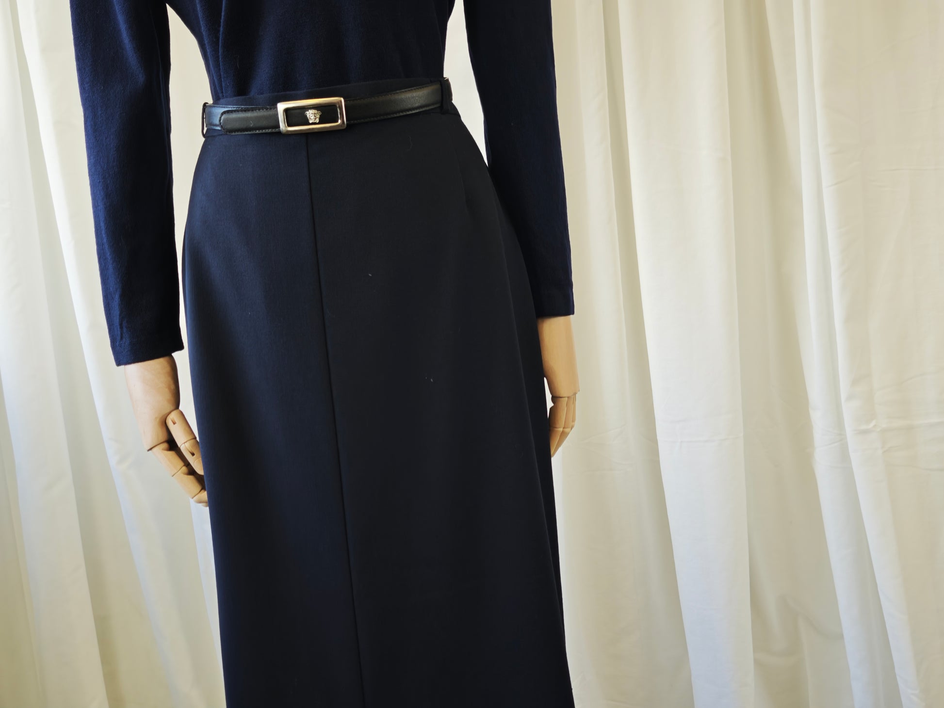 Vintage 90's navy blue wool pencil skirt, the skirt has elastic in the back which allows for some stretch. Small slit it both the back and the front.