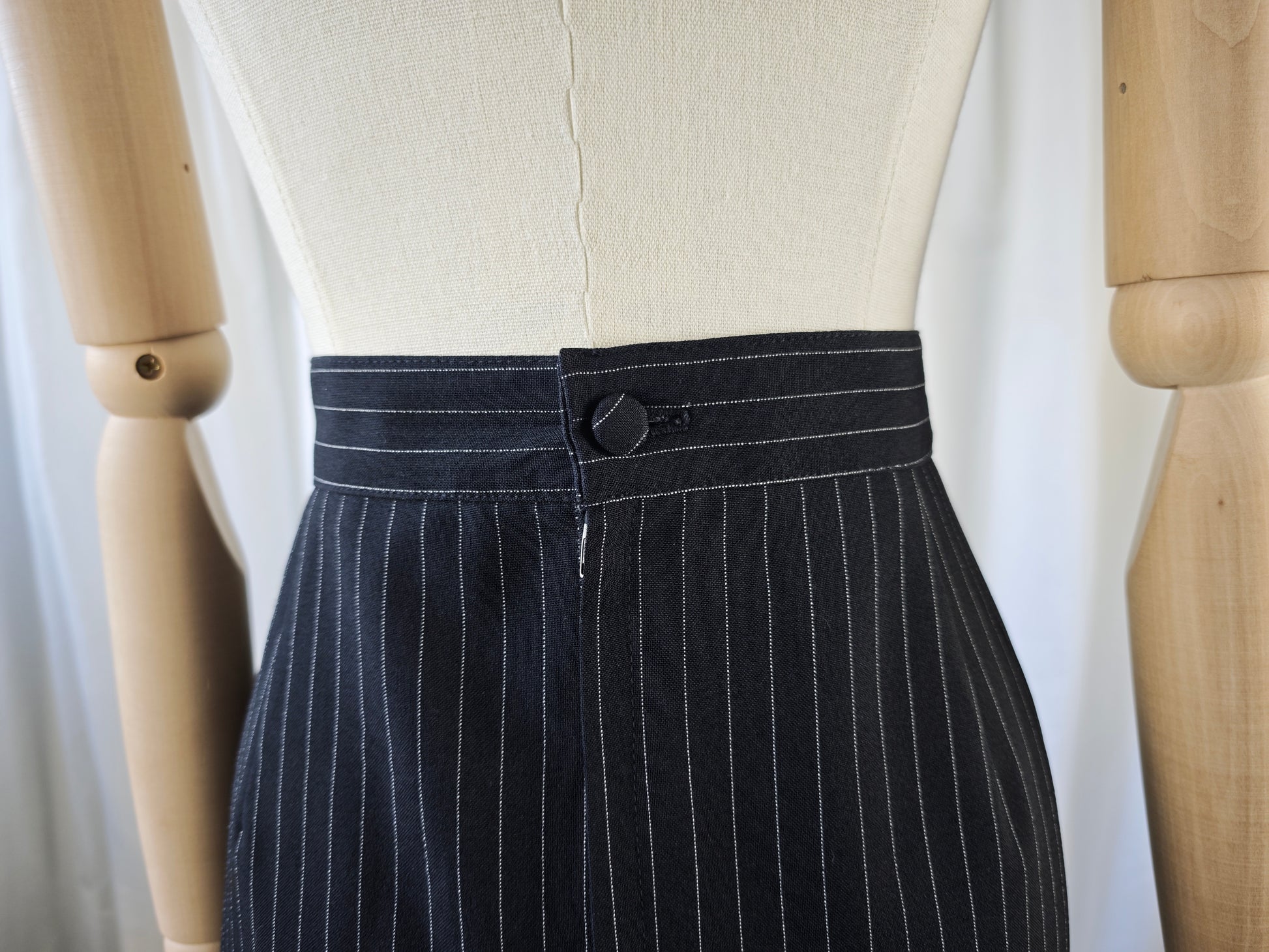 90's pinstripe pencil skirt with large visible pockets. Dark charcoal grey, the skirt has two small slits on the side.