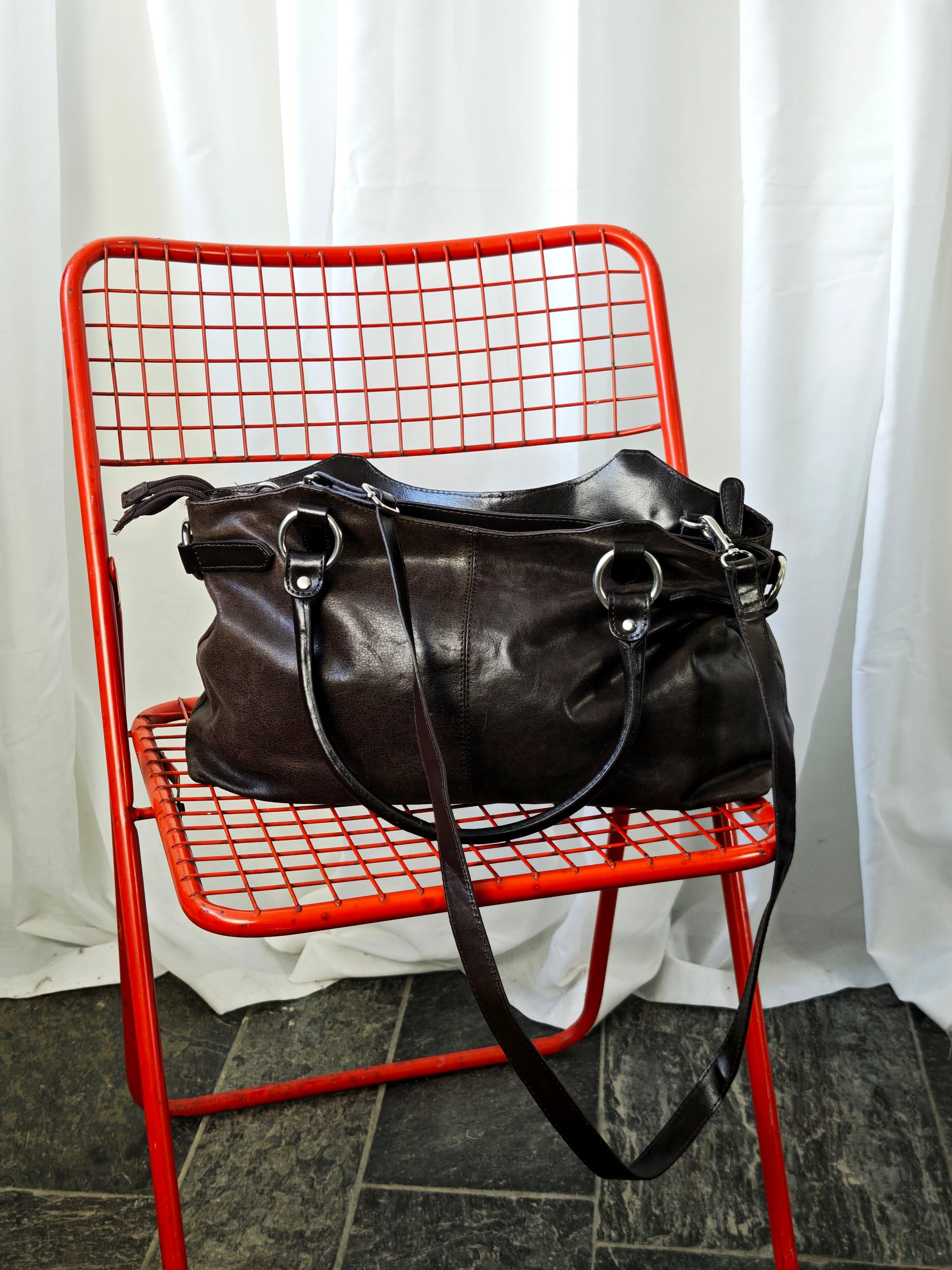 Chocolate brown slouchy bag with silver hardware details. can be worn as a shoulder bag or as a cross body bag. Good condition with signs of wear.